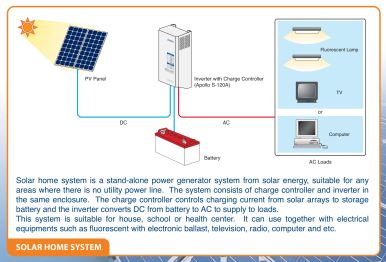 - เครื่องแปลงกระแสไฟฟ้า (Inverter) ทำหน้าที่แปลงพลังงานไฟฟ้าจากกระแสตรง (DC) ที่ผลิตได้จากแผงเซลล์แสงอาทิตย์ ให้เป็นพลังงานไฟฟ้ากระแสสลับ (AC) เพื่อให้สามารถใช้ได้กับอุปกรณ์ไฟฟ้ากระแสสลับ แบ่งเป็น 2 ชนิด คือ Sine Wave Inverter ใช้ได้กับอุปกรณ์ไฟฟ้ากระแสสลับทุกชนิด และ Modified Sine Wave Inverter ใช้ได้กับอุปกรณ์ไฟฟ้ากระแสสลับที่ไม่มีส่วนประกอบของมอเตอร์และหลอดฟลูออเรสเซนต์ที่เป็น Electronic ballast