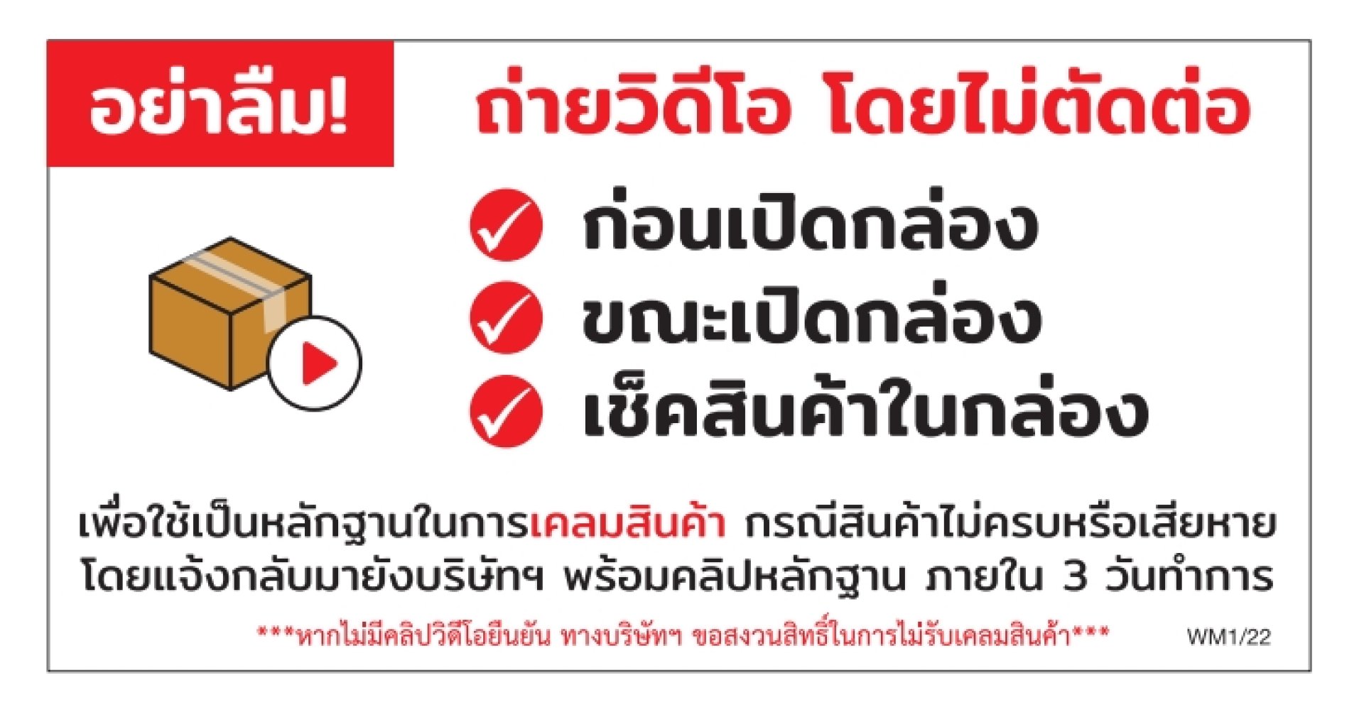 - สินค้าที่คืน ต้องอยู่ในสภาพใหม่ ยังไม่เคยถูกใช้งานมาก่อน และมีบรรจุภัณฑ์และอุปกรณ์ครบถ้วน พร้อมต้นฉบับใบกำกับภาษีที่ไม่มีการแก้ไข