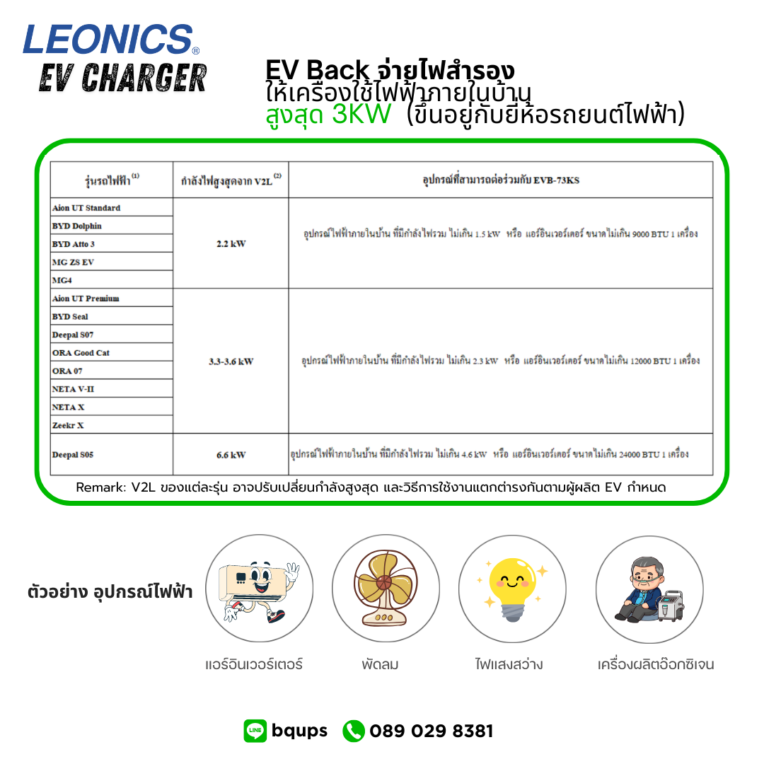 และจ่ายไฟจากแบตเตอรี่ของรถยนต์ EV ไปยังอุปกรณ์ไฟฟ้าภายในบ้าน (เจ้าของบ้าน ต้องเลือกโหลดที่จะต้องการสำรองไฟ และเดินไฟแยกเข้าที่ตู้ Home Energy Box (EVB-3K) ที่แถมไปพร้อมสินค้า